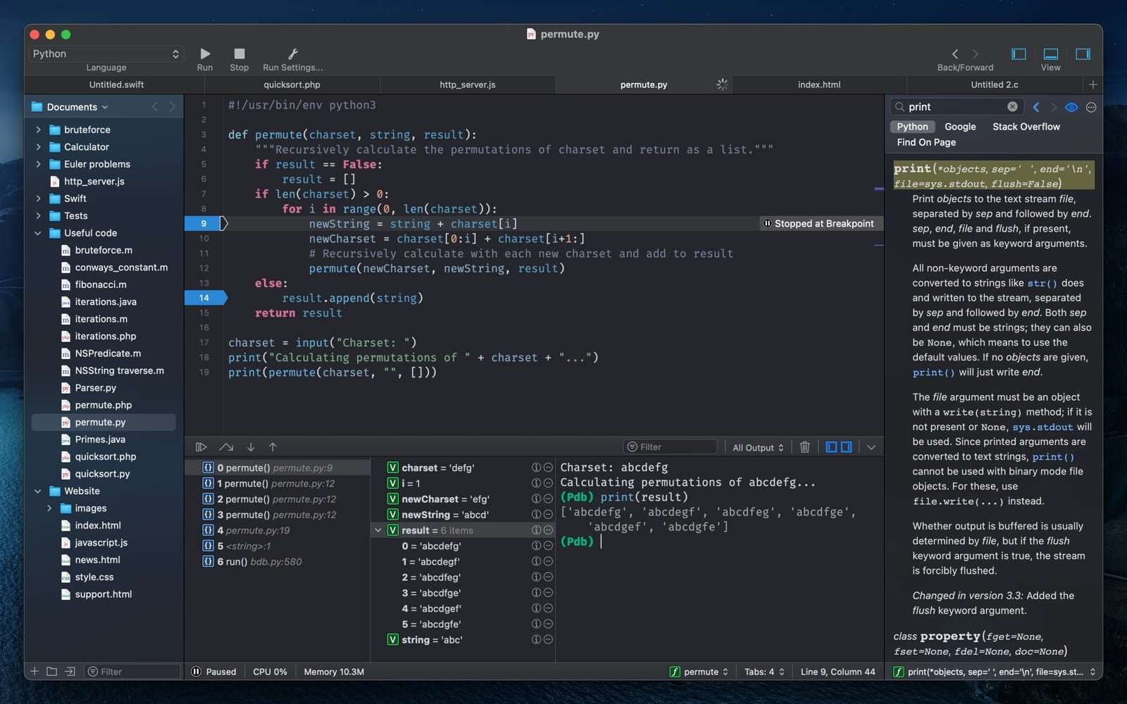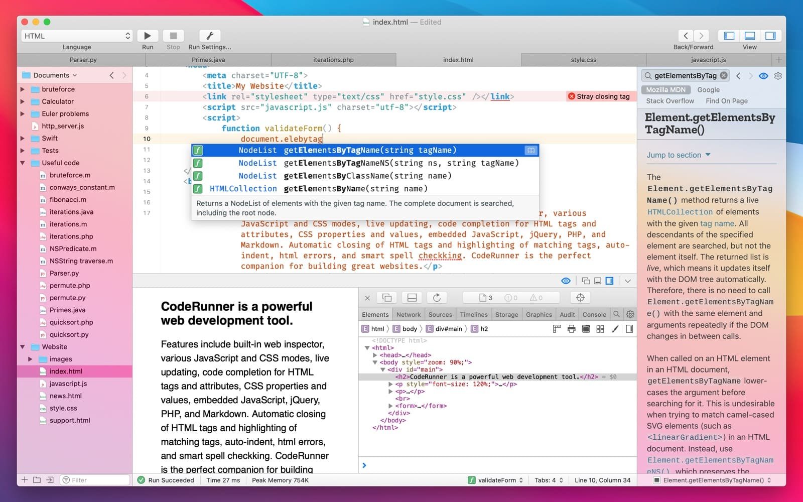 无需离开应用程序即可打开任何编程语言的在线文档。新的 CodeRunner 信息侧边栏允许您在现场查看函数、方法、类和其他符号。您甚至可以添加自己的文档作为搜索源,这将使您能够花更少的时间切换应用程序,同时您将更加关注编写漂亮的代码。