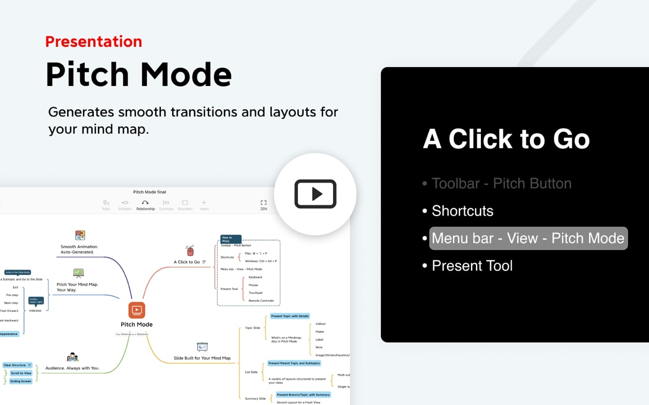 演说模式可自动生成转场动画和布局,一键即可展示你的思维导图。从头脑风暴到思维展示,在 XMind 中即可完成工作流闭环。告别繁琐,尽享高效。