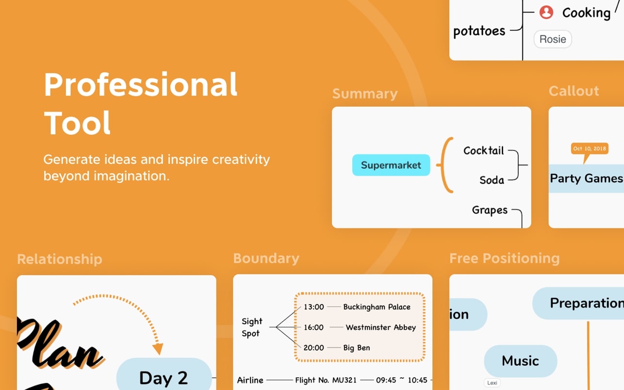 在细节处精心雕琢的全新界面风格,美观优雅,轻巧动人。适应起来毫不费劲,却又耳目一新。无边界的设计风格减少了视觉干扰,让你更沉浸于思维导图的绘制中。