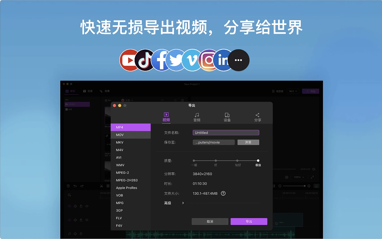 - 轻松输出适用于B站、YouTube等主流社交平台的视频。