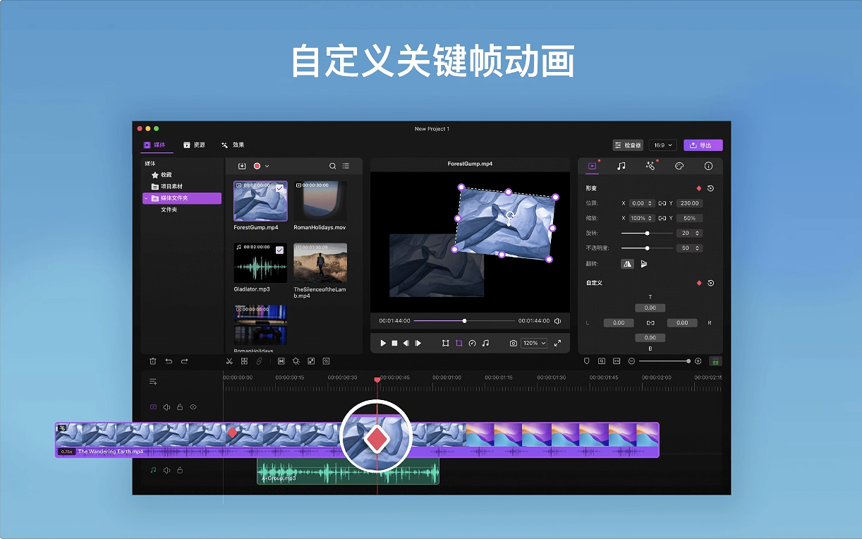 - 轻松添加与调整关键帧,实现贴纸、logo、视频片段的动态变换效果。