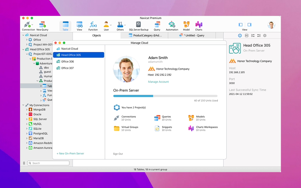 Navicat Premium 结合了其他 Navicat 应用程序的功能。通过为不同类型的数据库创建连接,Navicat Premium 可以轻松地在 MySQL、Oracle 和 PostgreSQL 数据库之间传输数据。它支持 MySQL、SQLite、Oracle 和 PostgreSQL 中的大部分特性,包括存储过程、事件、触发器、函数、视图等。