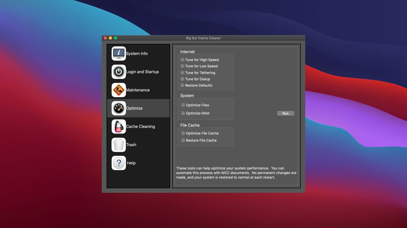 Monterey Cache Cleaner 可以通过调整 Internet 和文件缓存设置、实施 ram 磁盘以及清除各种缓存和陈旧数据来提高系统性能。MCC 包括帮助优化文件和内存的工具。MCC 可以通过消除语言本地化文件和精简通用二进制文件来恢复浪费的磁盘空间。