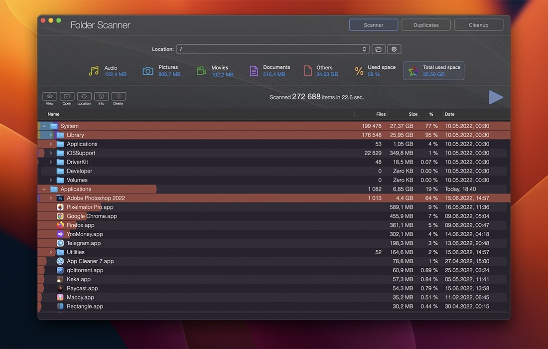 重复文件检测器通过查找和删除重复文件和文件夹来释放磁盘空间,从而使您有机会恢复千兆字节的磁盘空间。此扫描可以显示您保存的相同文档或照片或其他类型文件的多少副本,分散在您的磁盘中。所有重复文件都经过逐字节检查,以 100% 保证它们是准确的副本。