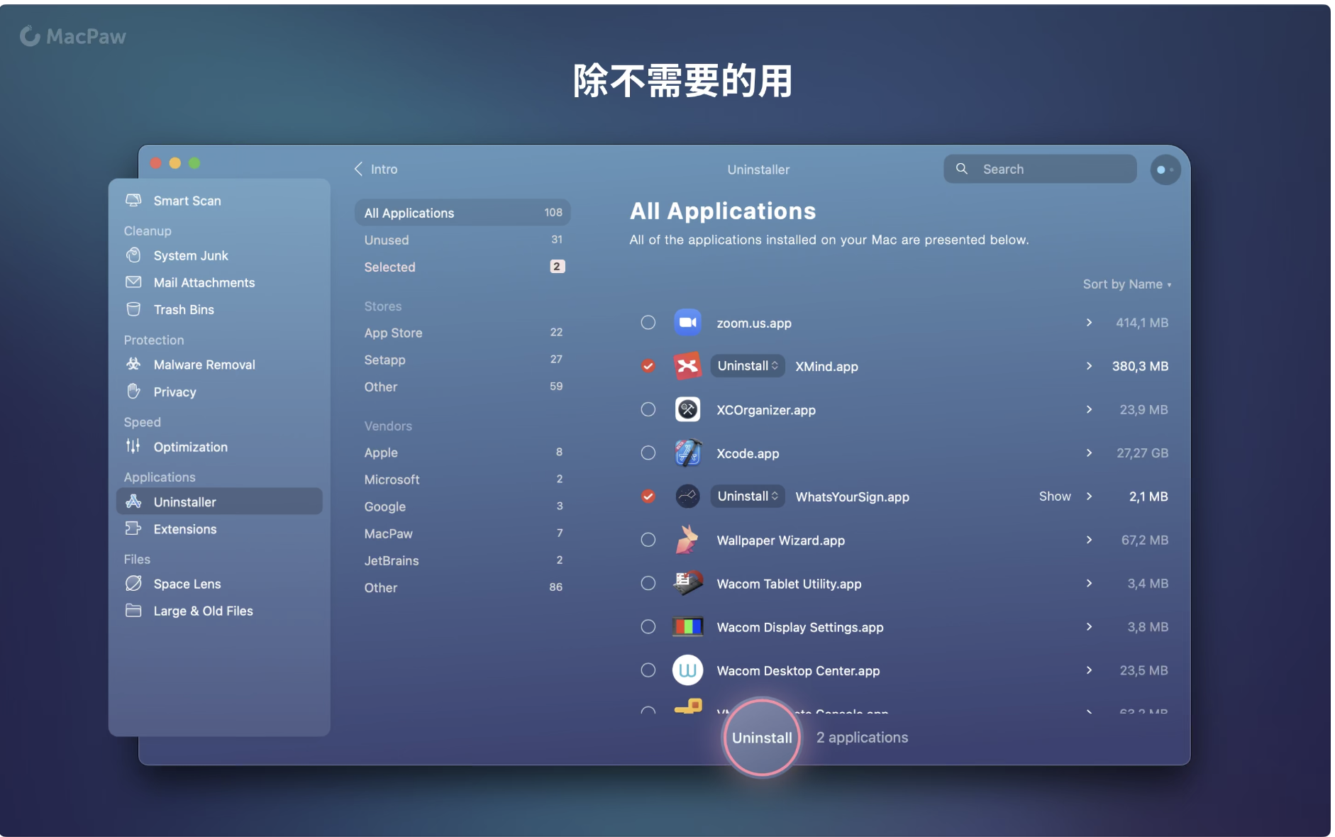 为了使Mac的生活更加井井有条,您将获得一个很棒的卸载程序和更新程序二人组。前者会完全删除不需要的应用程序,而后者会立即更新您的所有软件。错误的应用会消失,而新的应用总是会按时到达。这有助于解决软件冲突,并使Mac永远年轻。