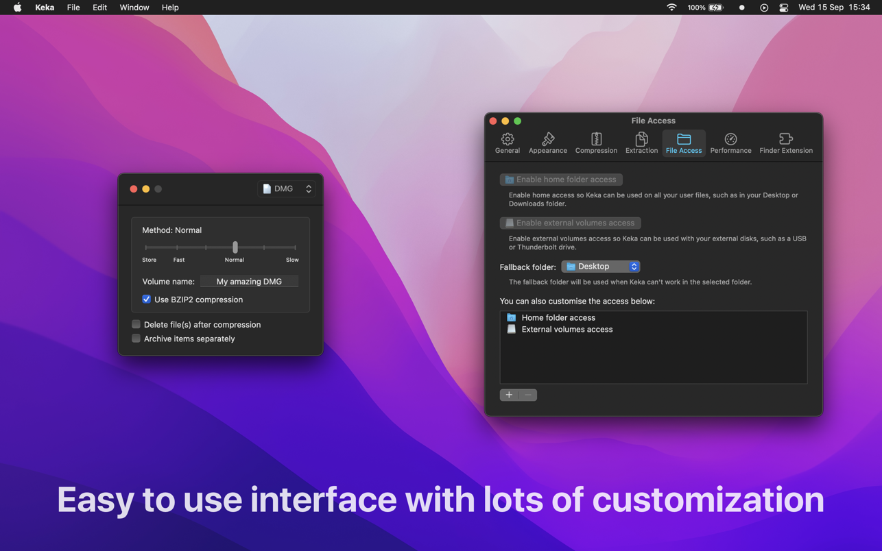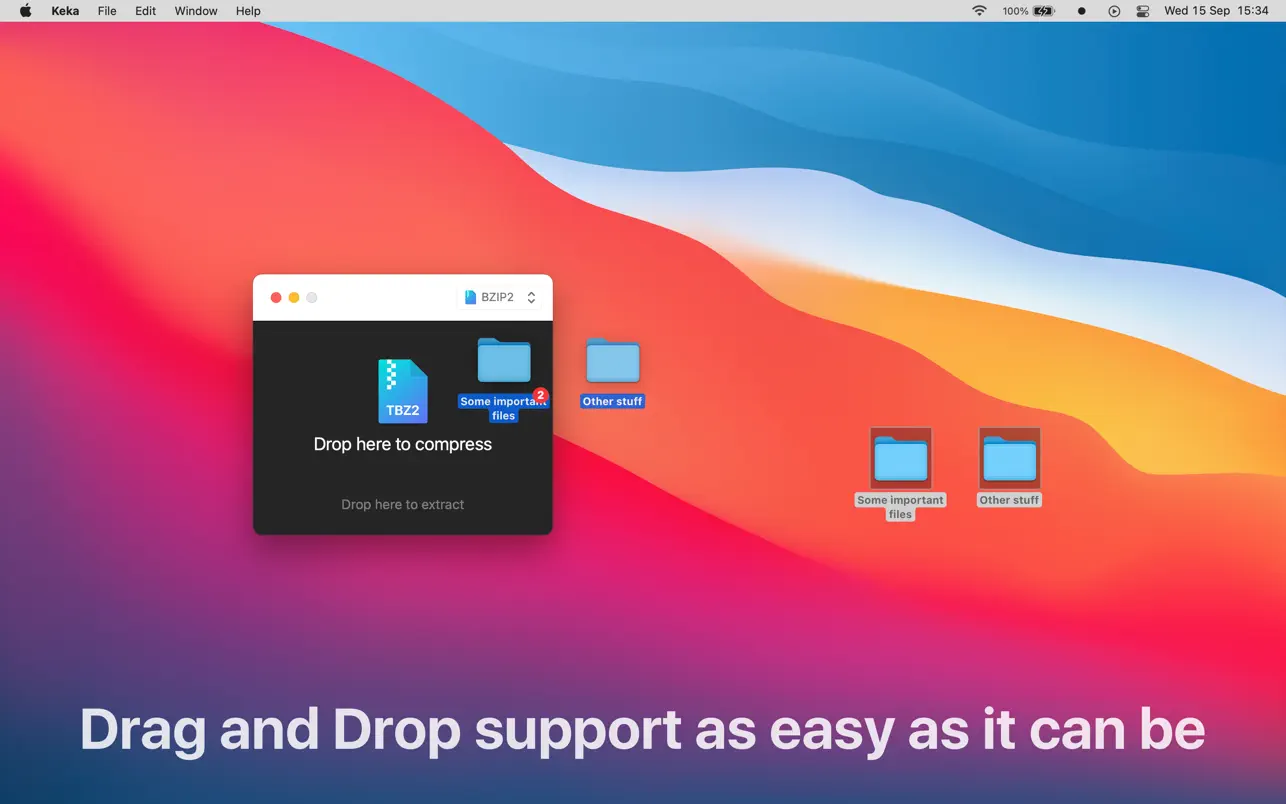 使用 Keka,您可以以多种格式压缩任意数量的文件。分割文件并用密码保护它们现在是一个儿童游戏。只需将要压缩的文件拖放到 Dock 或主窗口中的 Keka 图标即可。