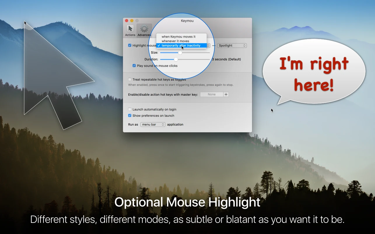 • 通过突出显示鼠标来定位鼠标:使用三个醒目的图像之一在鼠标移动时突出显示鼠标,仅当 Keymou 移动鼠标时,或在一段时间不活动后临时突出显示鼠标。