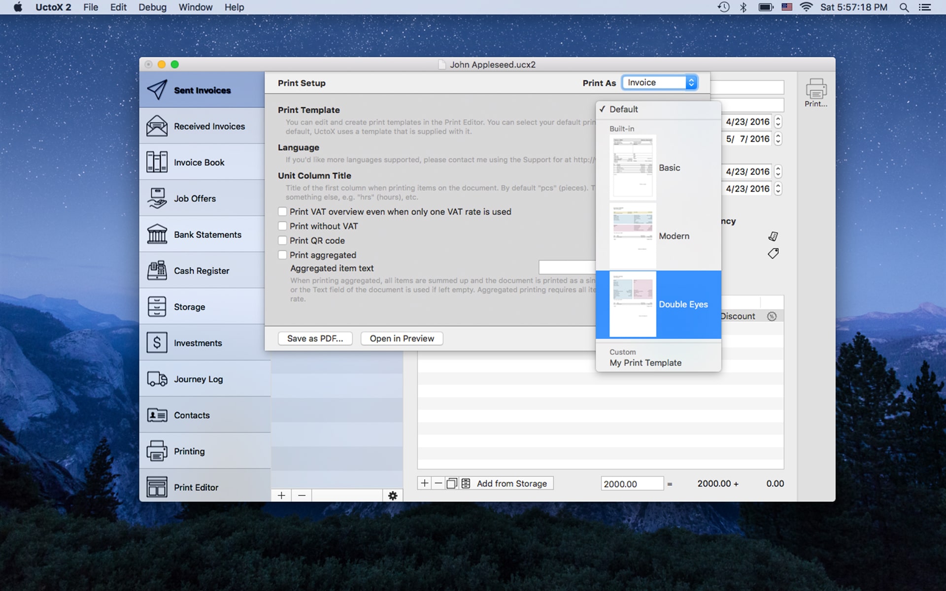 UctoX 附带一些发票模板,但您不限于它们,因为它们可以使用应用程序的打印编辑器创建。