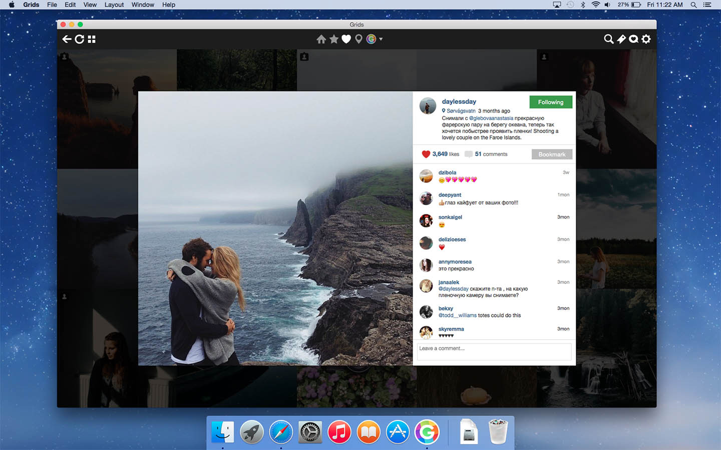 主窗口是保留的,用于显示图像的缩略图,但是,如果单击图像,则可以看到谁发布了图像,何时发布以及喜欢它的人数。此外,您可以阅读以前的评论,并发表自己的印象。