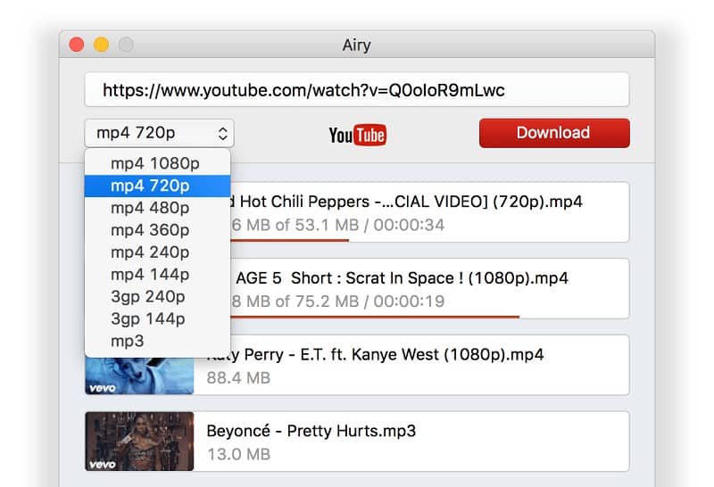 一个简单而整洁的 Mac YouTube 下载器:同时开始多个下载,选择要保存视频的格式并选择所需的分辨率。Airy 可以下载整个 YouTube 播放列表和频道。