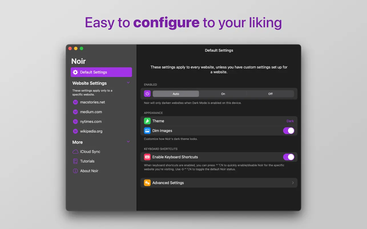 Noir 可自动与您在 Safari 中访问的任何网站配合使用。默认情况下,Noir 与您设备的黑暗模式相关联,因此网站只会在您需要时才会变暗。但是您可以根据自己的喜好轻松自定义它,即使是每个网站。只想在几个特定网站上使用 Noir?确定的事!在某些网站上禁用 Noir?没问题!
