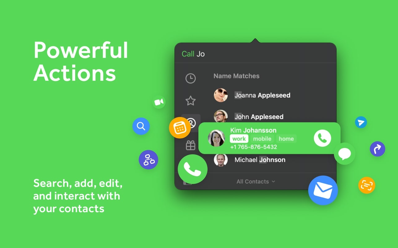 只需输入“John G”,约翰卡就会立即出现。输入“Sarah Smith”sarah@cardhopapp.com“Cardhop将在Sarah的卡片上添加一个新的联系人。或者输入“打电话给迈克尔C。“Cardhop会立即在Mac上给Michael打电话,甚至直接打电话给你的iPhone!