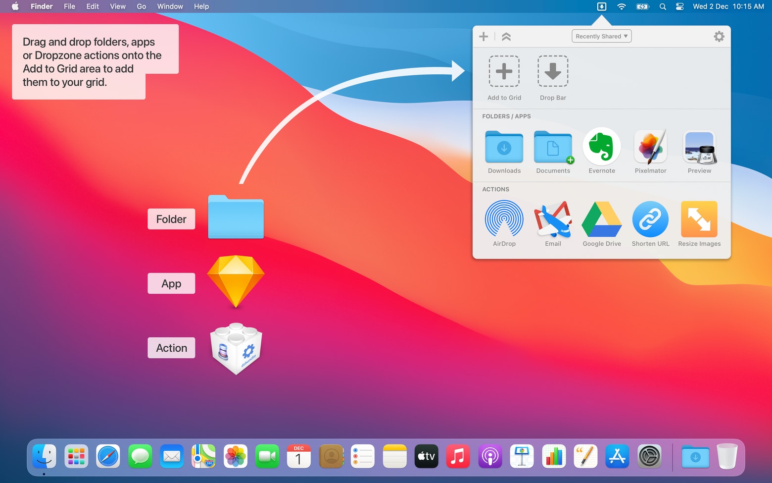 以您想要的方式定制和定制您的 Dropzone 网格。只需将应用程序、文件夹或活动拖动到“添加到网格”区域即可添加它们,您就可以开始使用了。稍后,您可以重新排列它们或为每个操作设置热键,让您无需触摸鼠标或触控板即可使用 Dropzone。