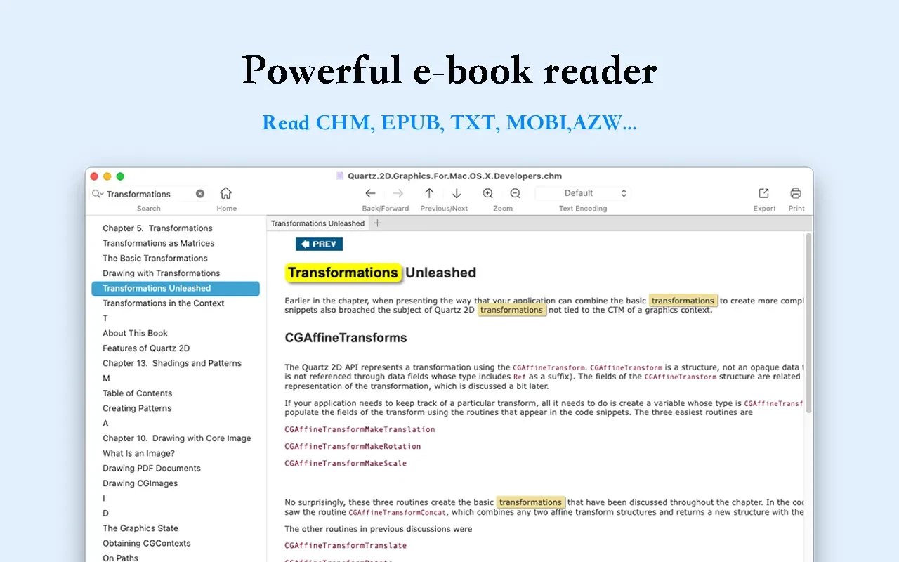 – 支持阅读 EPUB、CHM、TXT、HTML 及 Kindle(MOBI、AZW3、PRC、TPZ、AZW、AZW4、AZS、AZL) 等文件。