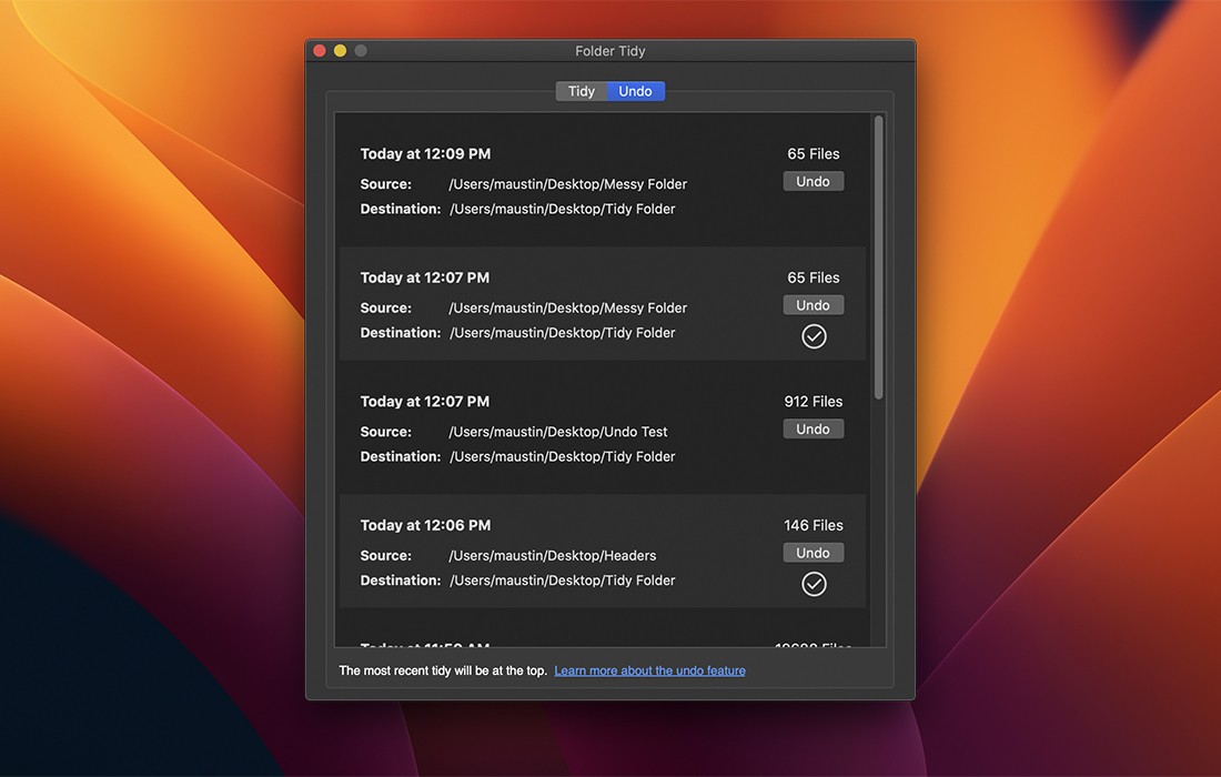 对结果不太满意?撤销 “按钮可以将所有文件恢复到原来的位置。新颖的历史撤消功能允许在日后逆转任何整理操作。