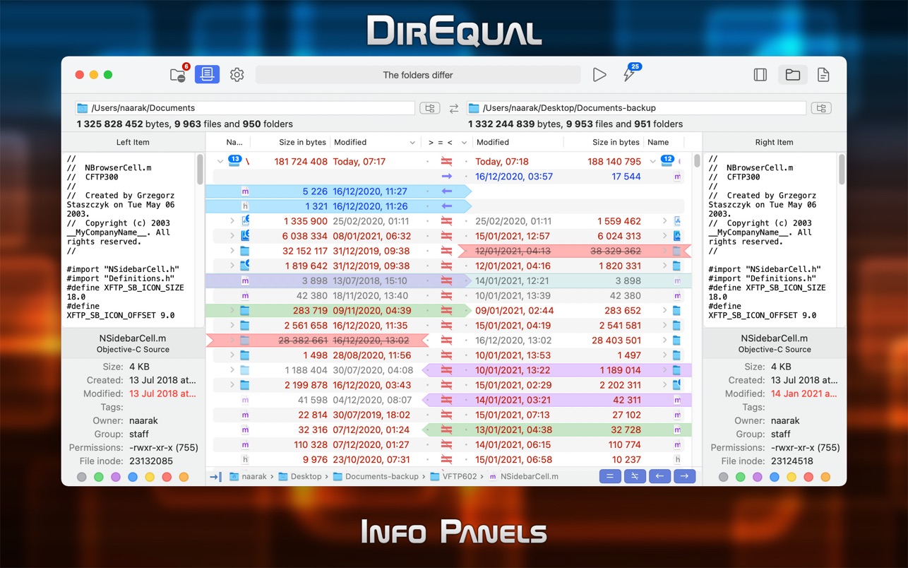 DirEqual 将比较的目录并排显示为可扩展的树,并为每个项目指示大小和日期。目录之间的差异用颜色和易于识别的图标表示。