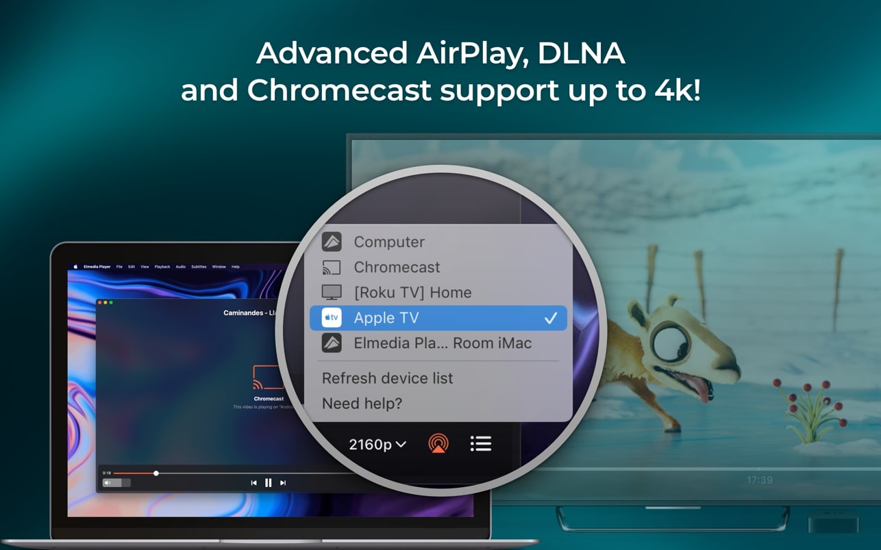 Elmedia Player 提供广泛的 AirPlay 支持。您可以将视频从带有 Elmedia 的 Mac 流式传输到其他带有 Elmedia 的 AirPlay 和 Mac 设备。您还可以从任何 AirPlay 设备流式传输到 Mac 上的 Elmedia Player Pro。
