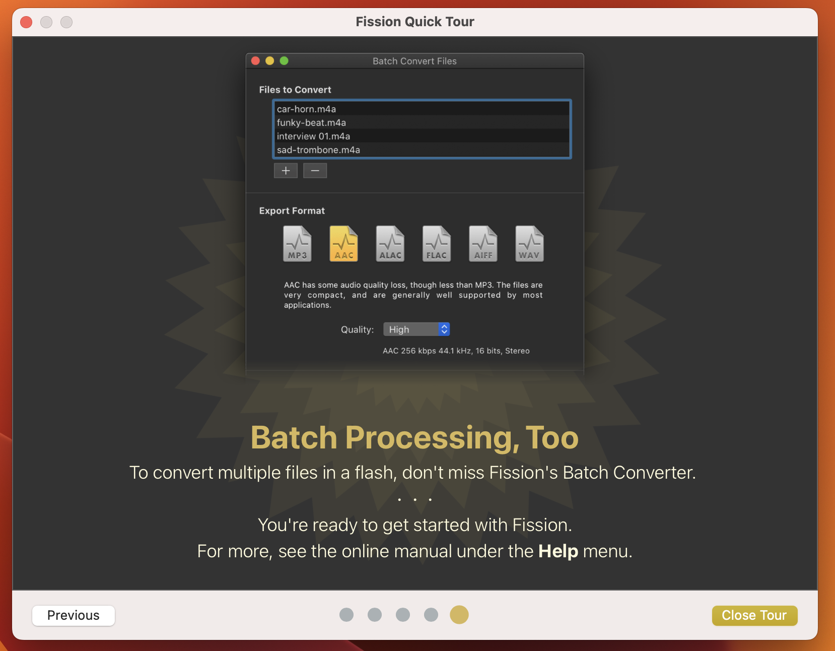 如果您需要在音频格式之间进行转换,Fission 也可以做到。将文件快速导出或批量转换为 MP3、AAC、Apple Lossless、FLAC、AIFF 和 WAV 格式。Fission 可以满足您的所有音频需求。最后,简单的音频编辑已经到来。
