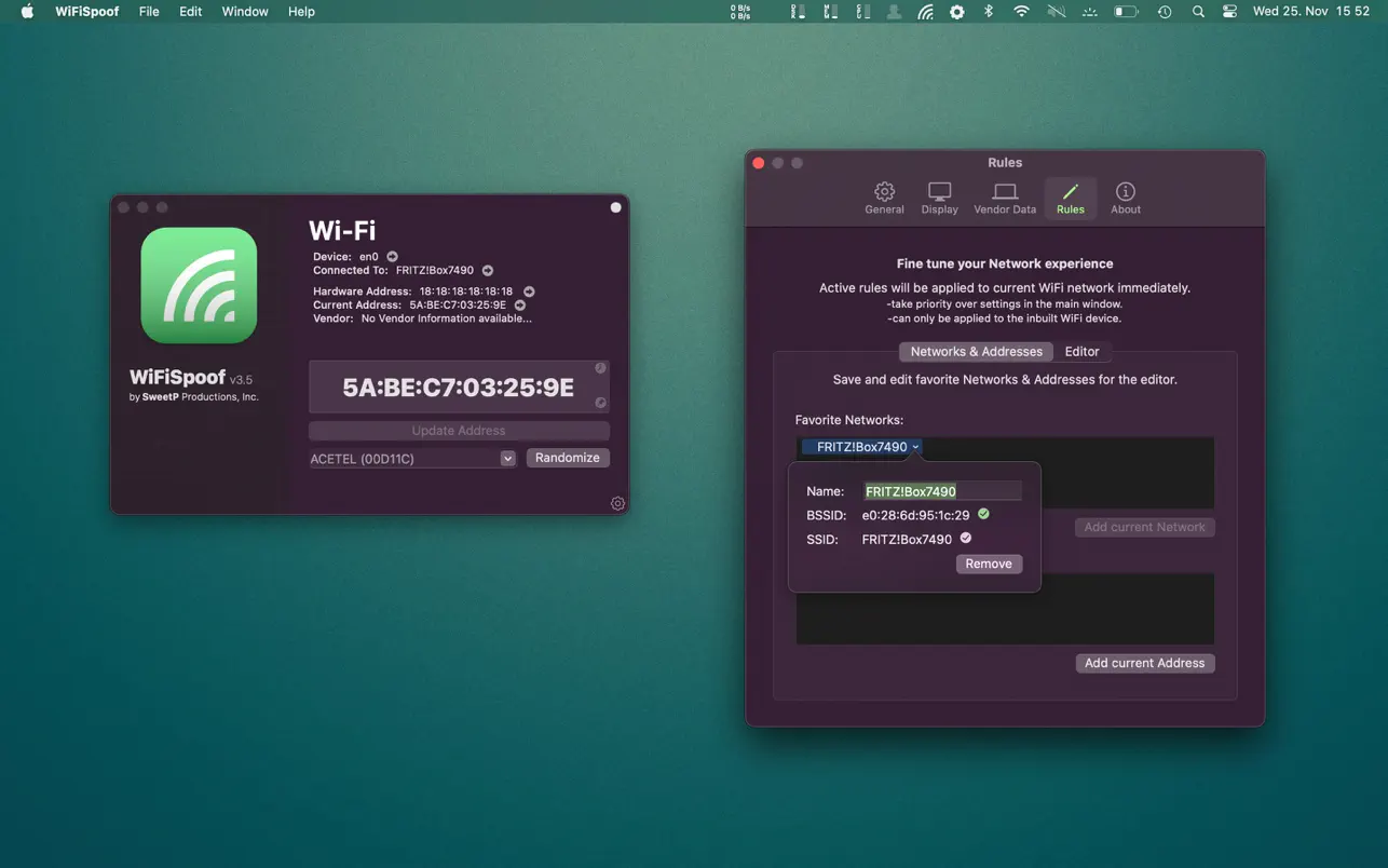 为所有您喜欢的网络设置自定义规则 – 在您最喜欢的咖啡店每 30 分钟随机设置一次,在工作中设置预定义的 MAC 地址,在家里设置不同的 MAC 地址。可能性是无止境。