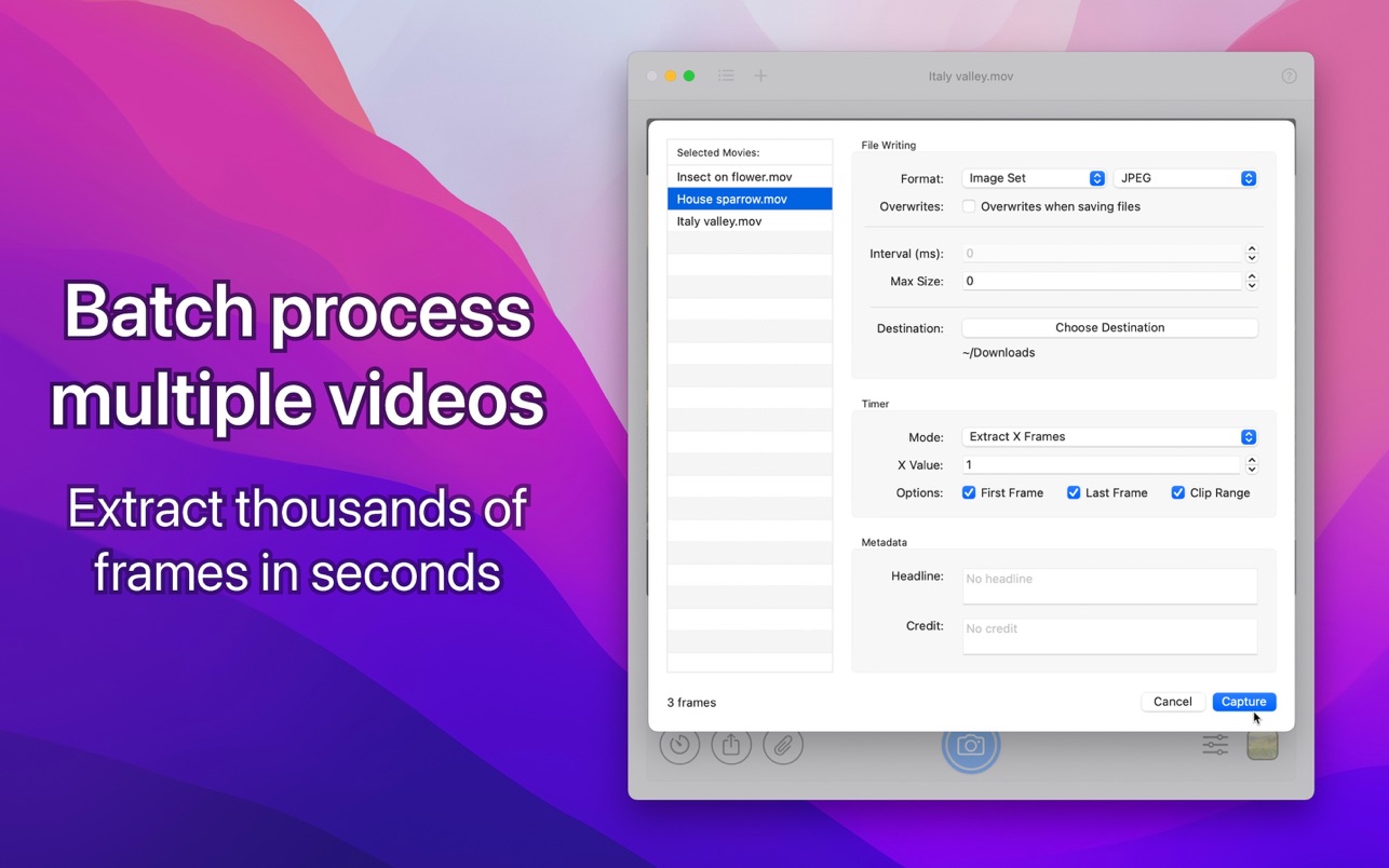 该应用程序允许您从 Finder 或照片中打开文件,并以最佳质量将图像捕获为所有行业标准格式。即使您的文件是一部厚重的 4K/8K 电影,SnapMotion 也会准确地提取每一帧,而没有任何延迟。