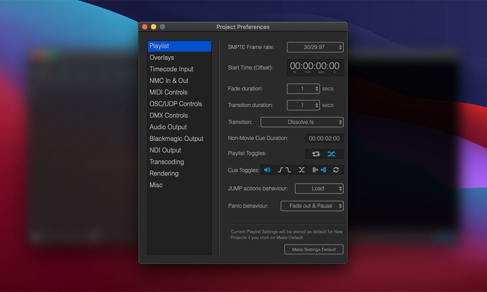 您可以在 Mitti 中从视频和静止图像文件、一组丰富的输入(包括摄像机、虹吸管和 NDI 源)创建提示。信号有自己独特的颜色、视频效果、音频输出和过渡设置。在 Mitti 播放列表设置中,您可以定义淡入/淡出和转场的默认时间,以及默认的 SMPTE 格式和 SMPTE 偏移量。以及更多。