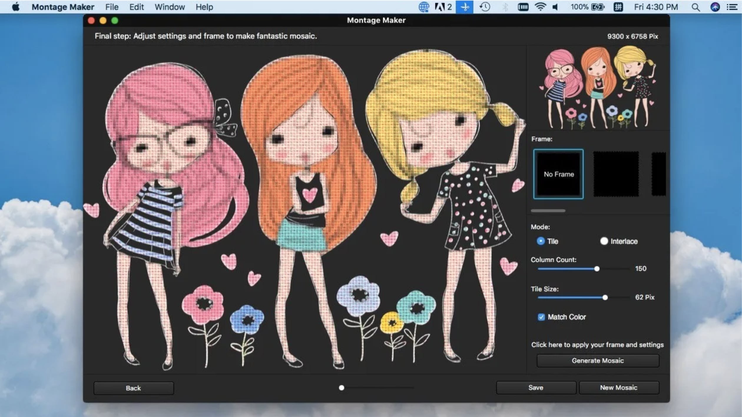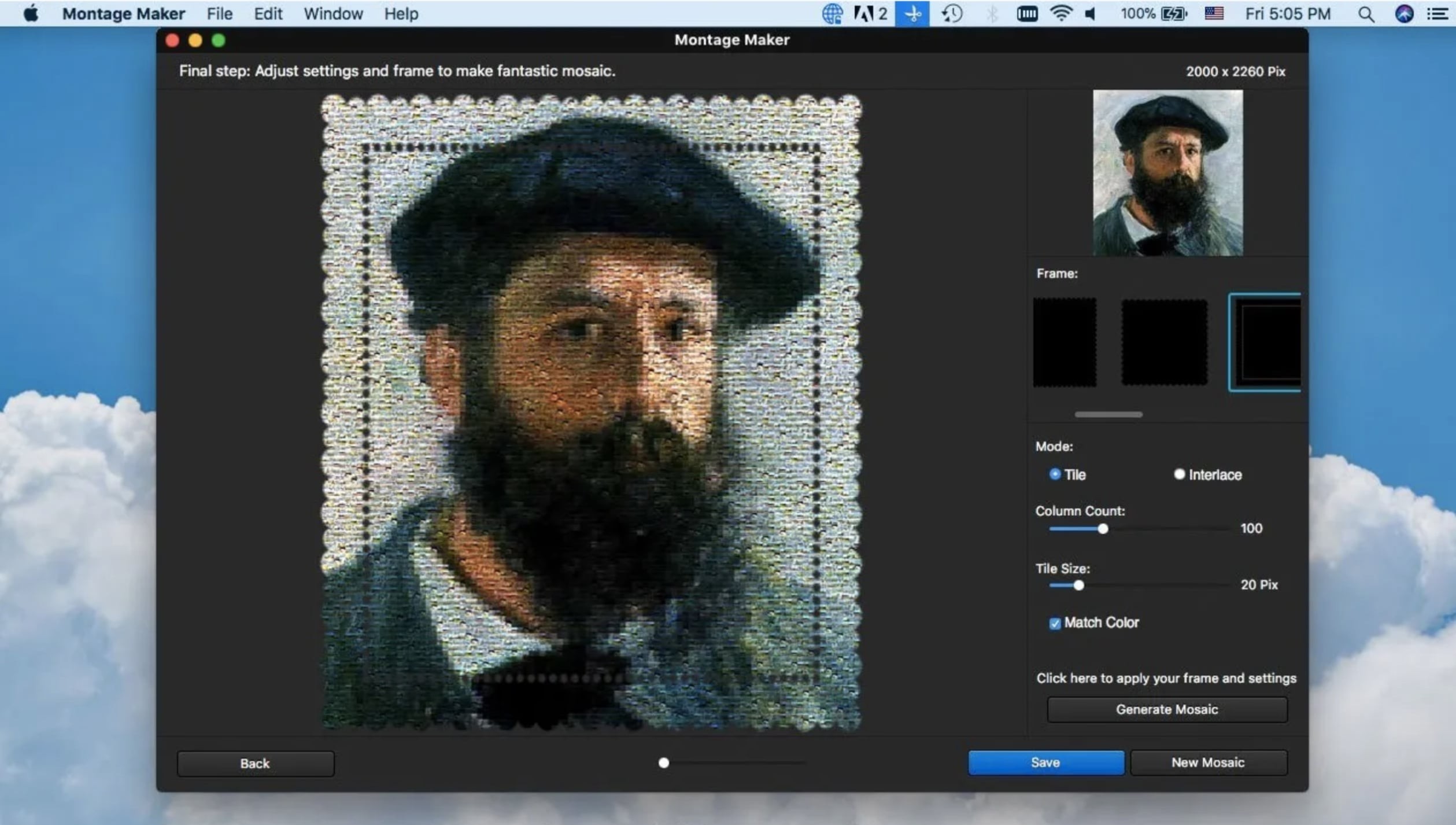 无论您需要为马赛克添加特殊的帧,还是使用不同的马赛克模式,您都可以选择不同的帧来使马赛克照片与众不同。程序支持平铺模式和隔行模式,您可以轻松获得所需的效果。照片马赛克的输出怎么样?该程序可以将 2,00 多个马赛克拼贴组合成令人惊叹的效果,最大 16,000 像素宽和无限像素高度用于蒙太奇照片,马赛克照片或照片拼贴可用于壁画、横幅、桌面甚至壁纸。