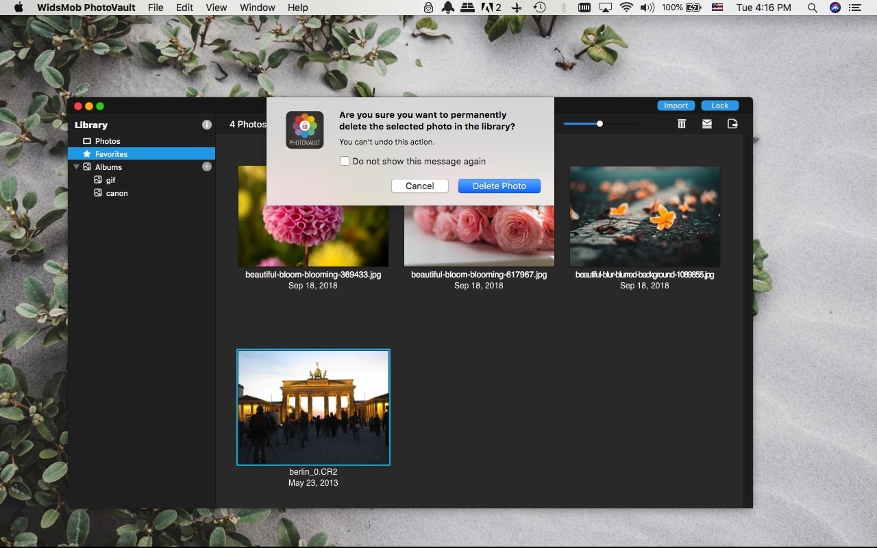 WidsMob PhotoVault 可帮助您加密和隐藏您的照片。它有两种不同的安全级别:隐藏照片的标准级别,施加出口限制的高级级别,分享您的照片或输入设置。更重要的是,它还允许您出于不同目的锁定屏幕。