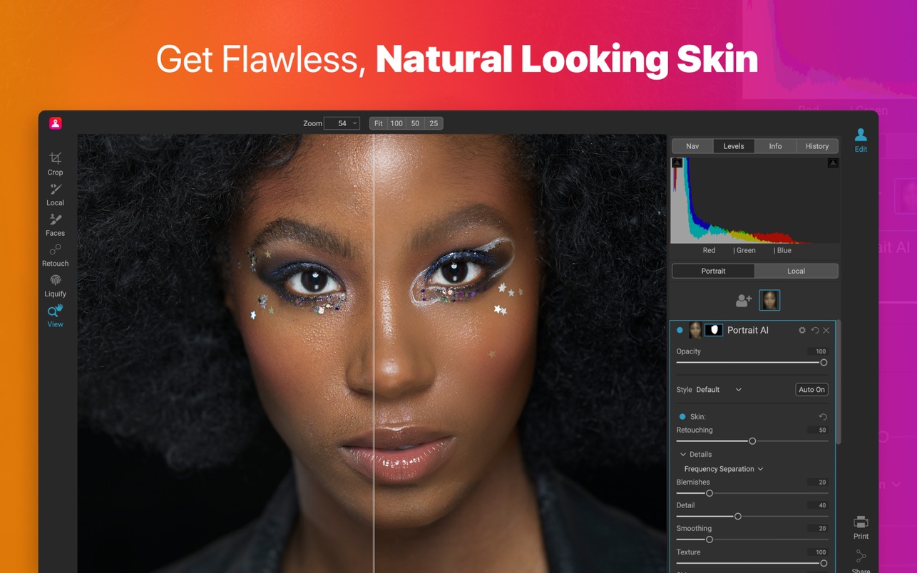 ON1 Portrait AI 2022 for Mac只需点击一下即可完美修饰。它使用机器学习来查找照片中的每一张脸,并自动使它们看起来很棒。它分析每张脸,并为皮肤、眼睛和嘴巴添加适量的修饰,立即为您提供专业的效果。