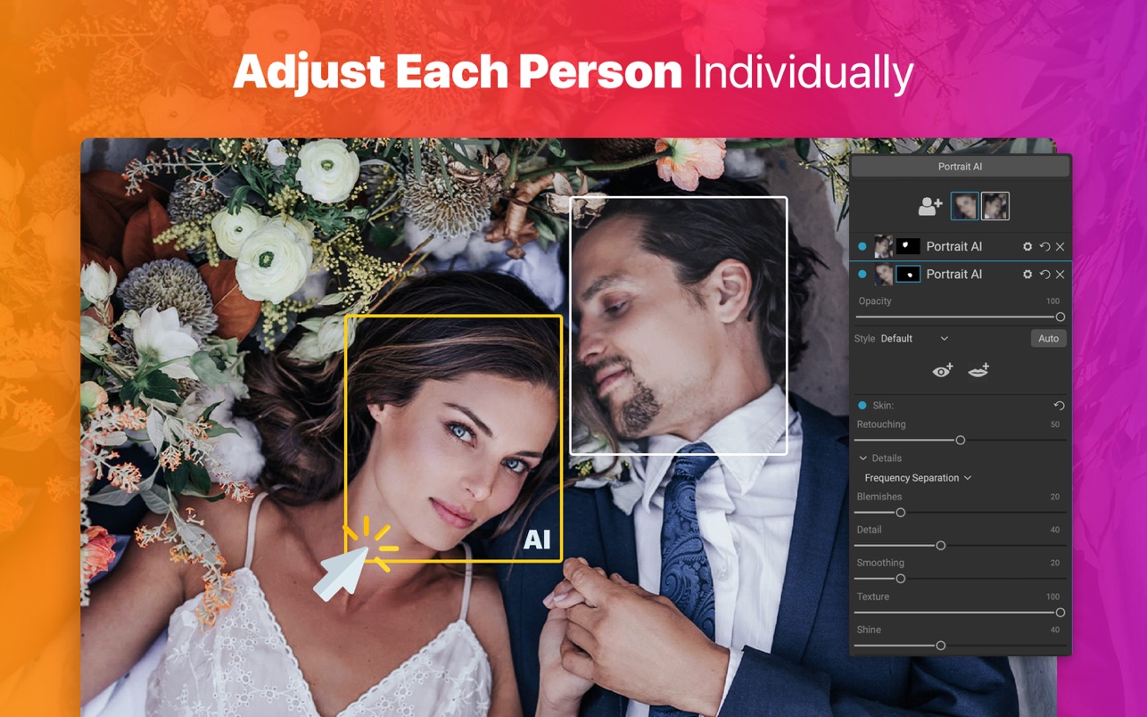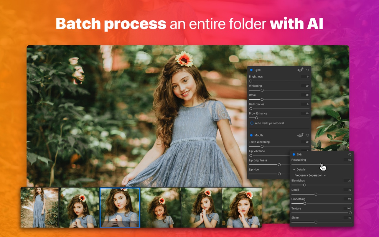 通过批处理整个照片文件夹,让 AI 为您服务。对于每张照片,人像 AI 会找到每张脸并自动添加适量的修饰。它非常适合在发送前检查您的照片。