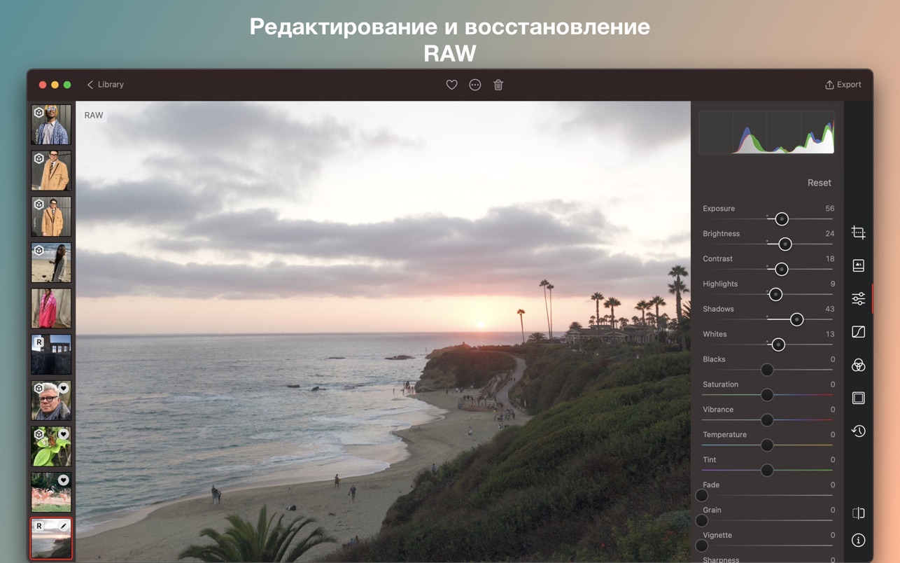 以全分辨率编辑 RAW 照片,并恢复阴影和高光中的全部细节。