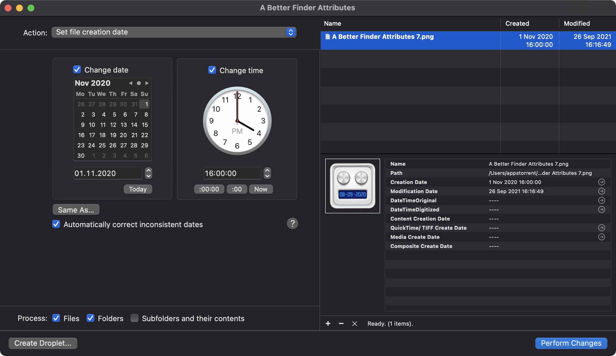 A Better Finder Attributes使您可以完全控制文件的创建和修改日期,将它们设置为特定的时间和日期,添加或删除时间或完全删除它们。
