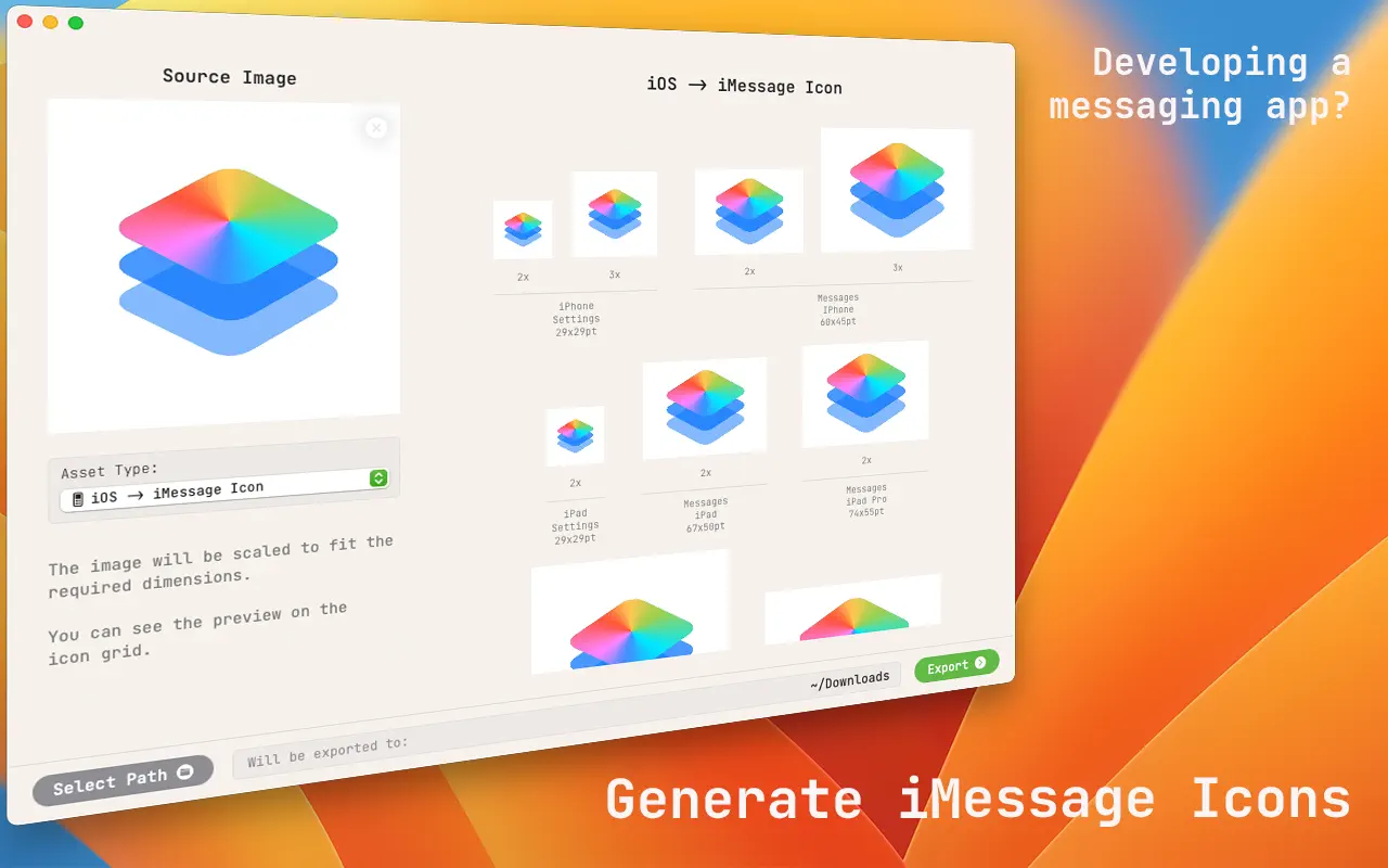 AssetsGen for Mac是一款专为Mac用户准备的开发软件工具,可以帮助开发者快速创建所需应用大小的图标和图片。在Assets for mac中用户可以快速的完成一系列简单的开发图片体验,为iPhone、iPad、iMessage和CarPlay、Apple Watch生成应用程序图标等。
