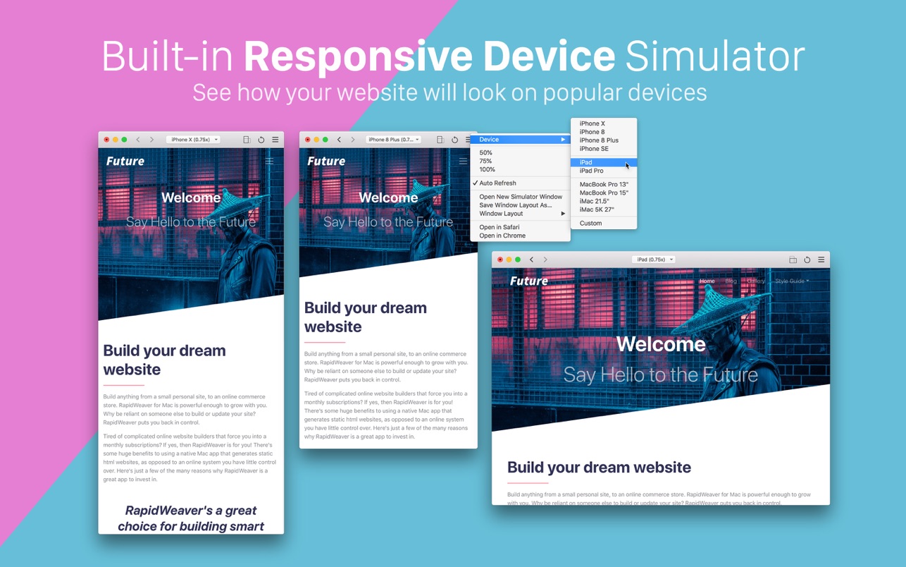 查看您的网站在 iPhone、iPad、iMac 等设备上的外观。RapidWeaver 中的新设备模拟器功能强大且灵活,您可以打开多个模拟器窗口、缩放它们,甚至将它们保存为集合以供以后使用。