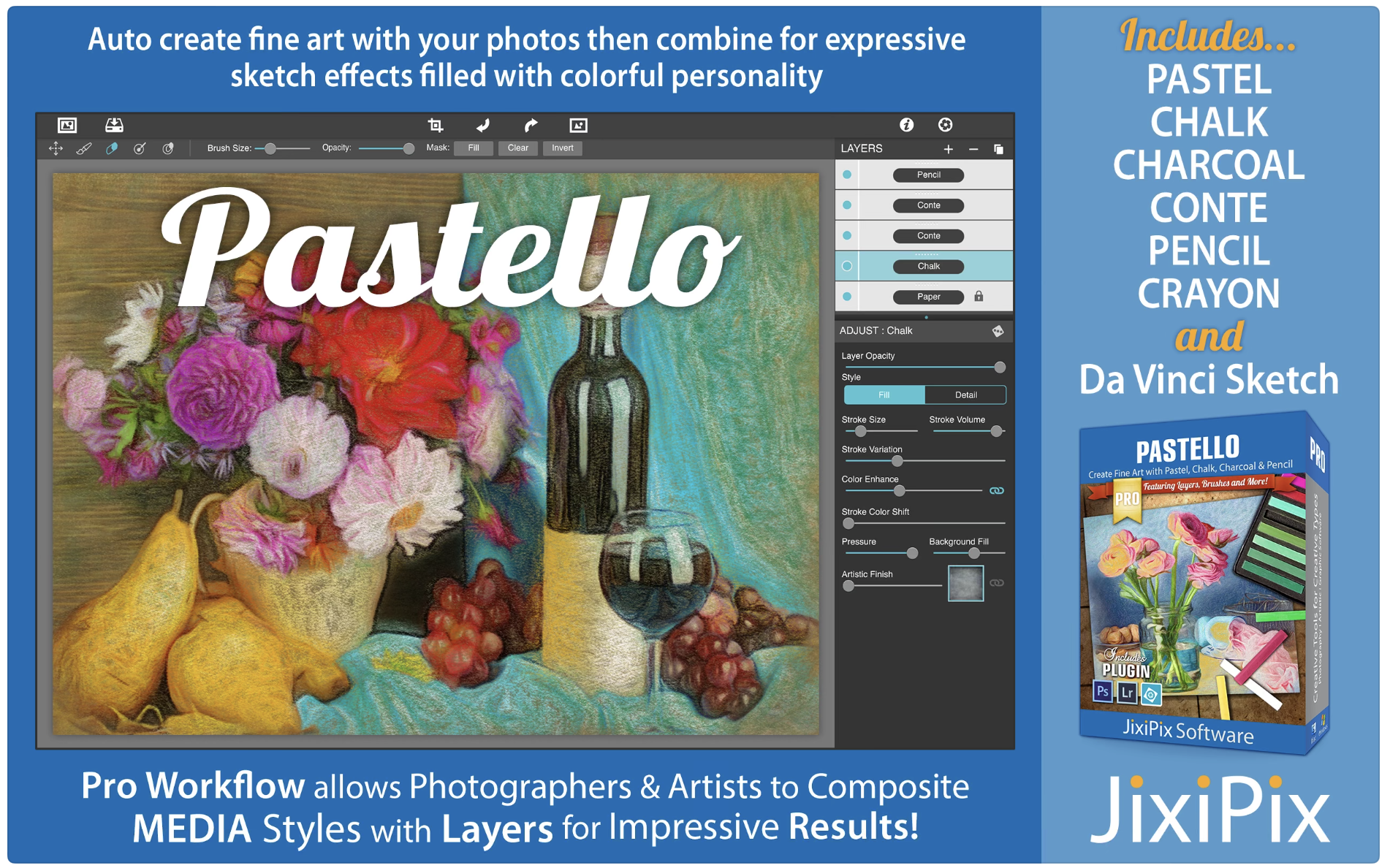 Pastello具有专业的工作流程,可自动将照片转换为蜡笔画并将其放置在具有自定义选项的美术纸上。然后可以使用“图层”样式将“粉彩”更改为“粉笔”,“木炭”,“彩色铅笔”,“石墨”,“孔戴”或“蜡笔”。媒体开始时就像传统图纸一样细腻,然后允许您使用填充,阴影和细节层进行构建。媒体本身是美丽的,或者将它们混合在一起以表达艺术作品。