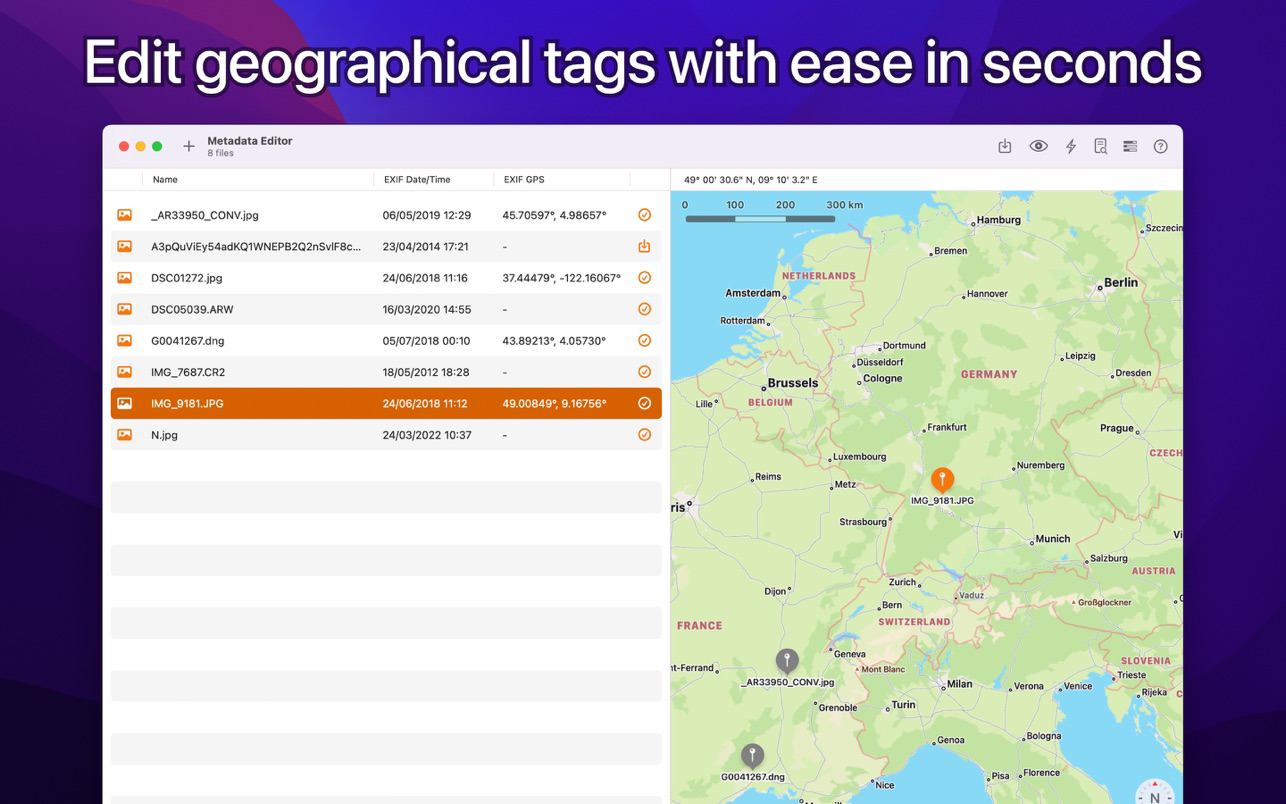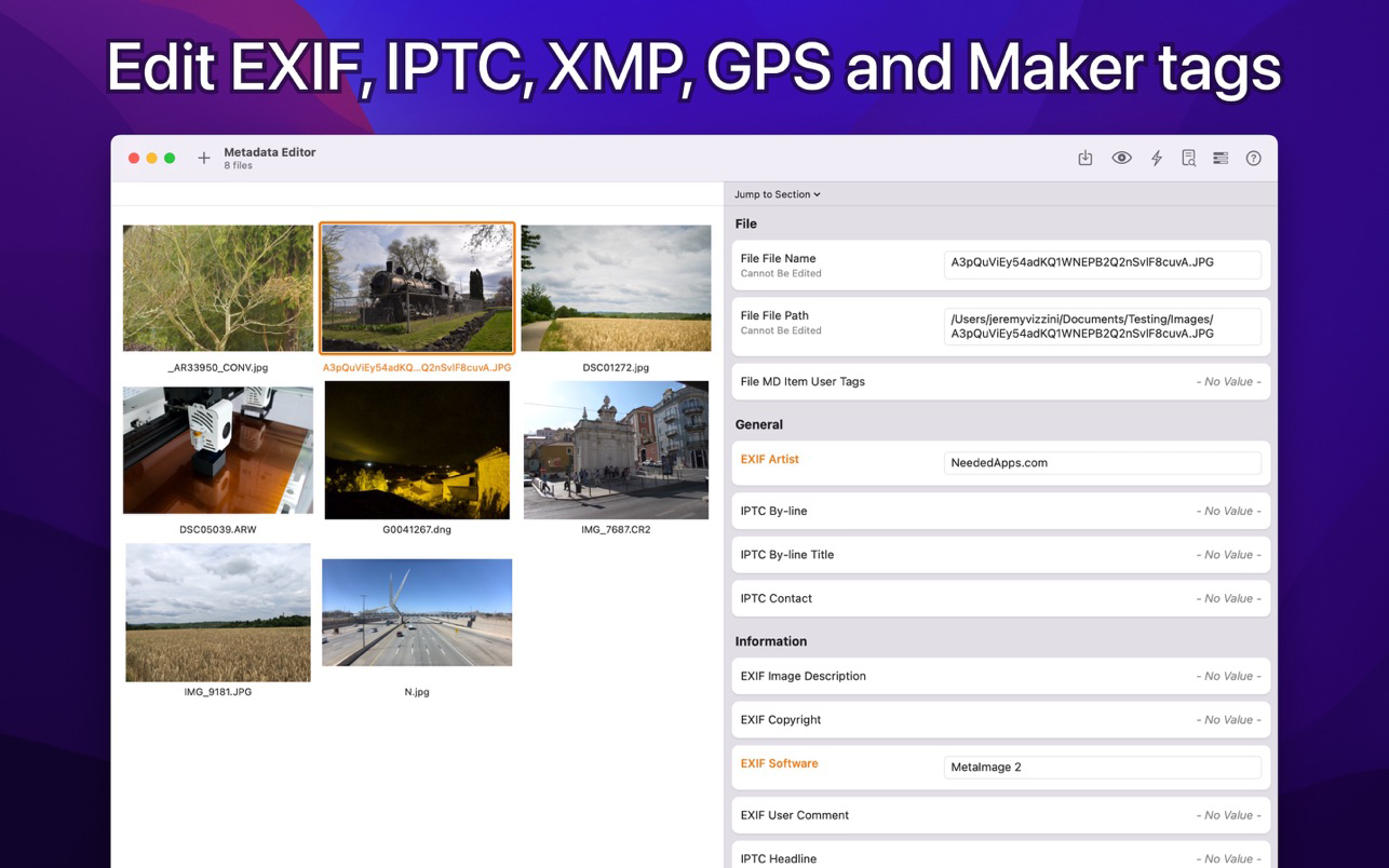 让 MetaImage 处理您在 Mac 上的图像元数据。您无需手动编辑照片应用程序中每张照片的数据,而是获得完全自动化的流程。处理各种标签格式,例如 EXIF、IPTC 和 XMP。灵活添加 GPS 坐标。创建预设并将相同的更改应用于多张图片。