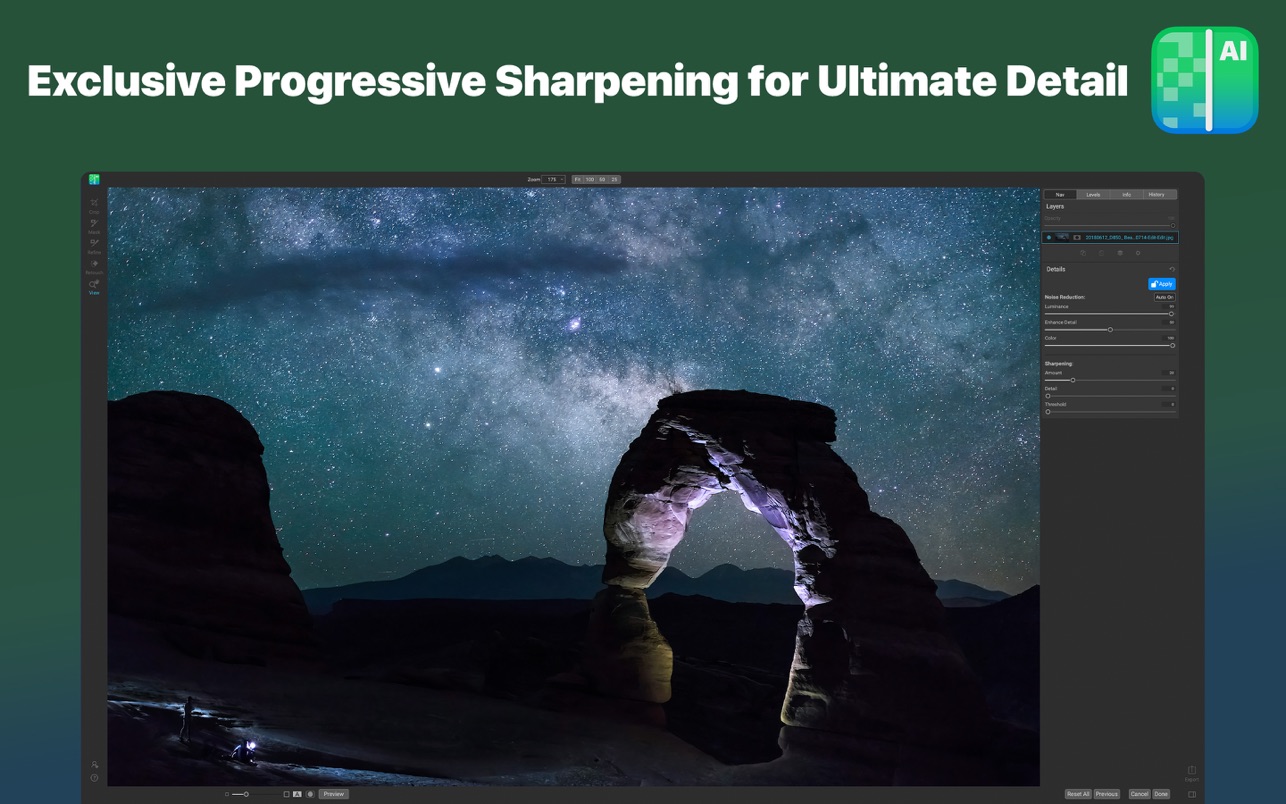 利用最先进的机器学习来构建 AI 网络,以消除亮度和颜色噪声,同时保持细节,这是其他应用程序无法产生的出色结果。