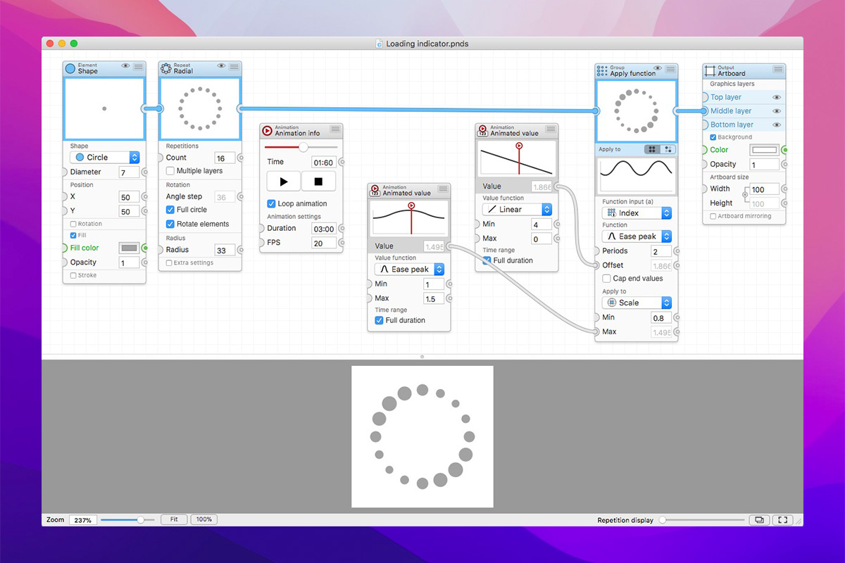 节点序列是完全非破坏性的,所以你可以在任何时候改变序列中的任何步骤,而不需要重做任何事情。这使得你很容易调整重复次数或元素属性,并立即看到最终结果。控制每个节点的参数也可以连接到其他节点,建立复杂的关系,一个属性控制另一个。最后,所有这些节点参数都可以在时间轴上使用关键帧进行动画。
