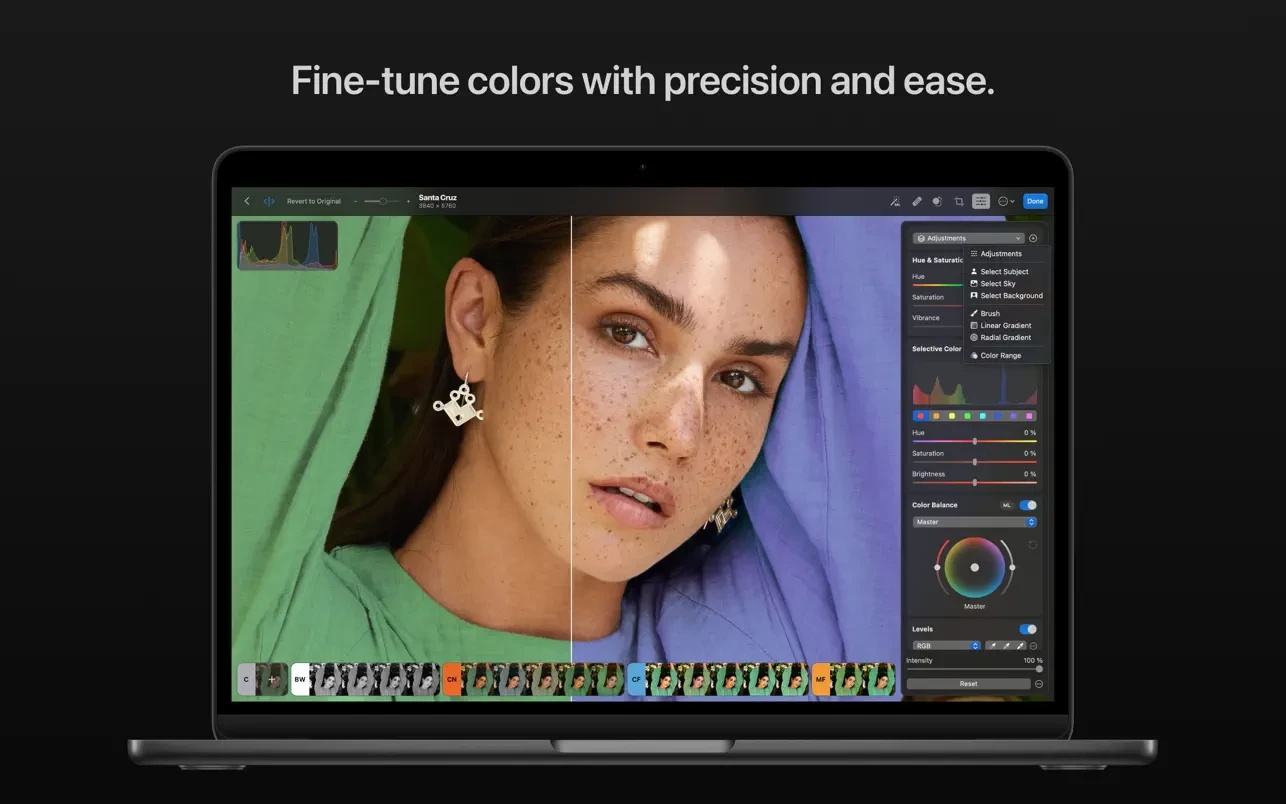 Photomator for Mac 是一款功能强大的修图工具,为提高、修复和管理您的图片提供了不可思议的工具。 其中包括了大量前沿的颜色调整功能,由 AI 驱动的自动选择功能,支持超过650种 RAW 图像格式,一款可以修复不想要对象的神奇工具,以及更多强大功能。 简单来说,就是制作精美照片所需的一切。