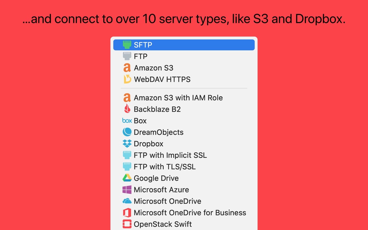 是的,Transmit 仍然处理经典的文件——FTP、SFTP、WebDAV 和 S3——比任何文件都好。我们使复杂的服务拖放变得简单。