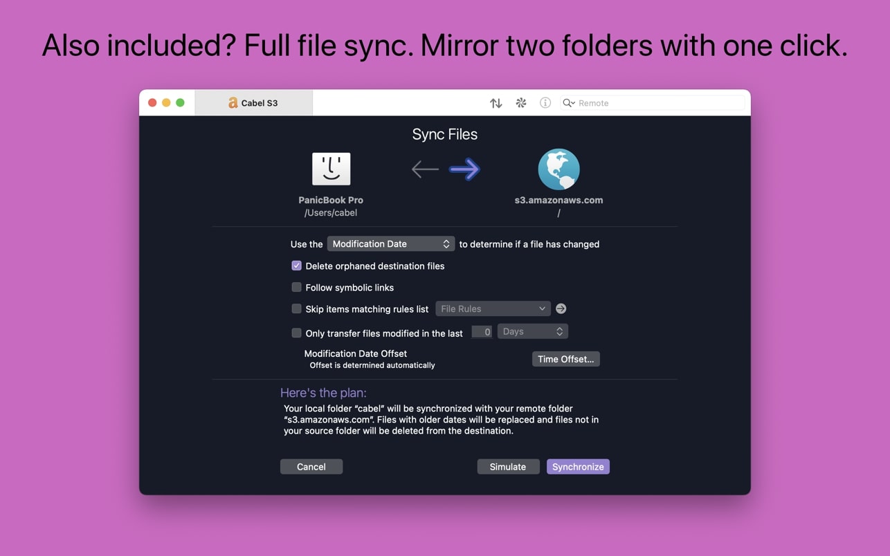 Transmit 5 现在包括 Panic Sync,这是我们同步您网站的安全且快速的方式。(您可以在此处了解紧急同步。)我们的文件同步功能增加了对本地到本地和远程到远程同步的支持,同时还为您提供更细粒度的控制。