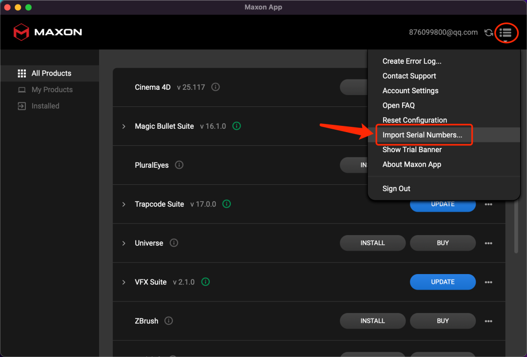 12.账号登陆后会来到这个界面,我们点击右上角的横杆,在弹出的菜单选择如图中的选项,这里就是输入注册码的地方;