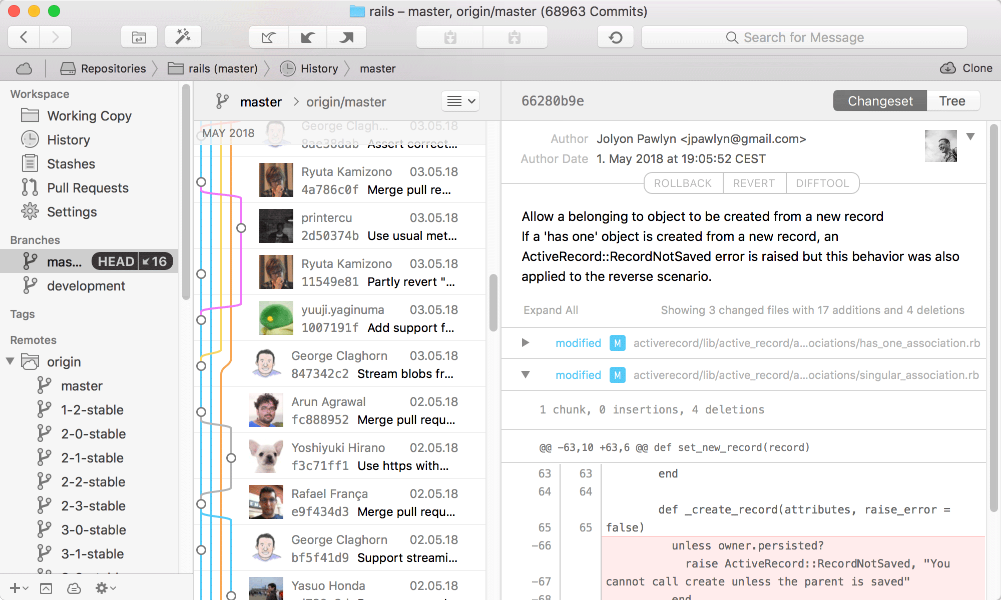 • 许多强大的拖放功能包括合并、变基、推/拉到/从远程,应用存储,创建新分支等。