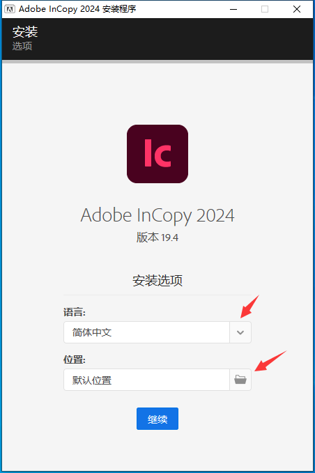 3、自定义安装位置,选择语言,点击继续(如下图)