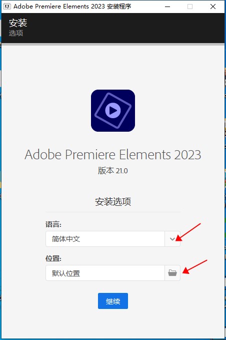 3、自定义安装位置,选择语言,点击继续(如下图)