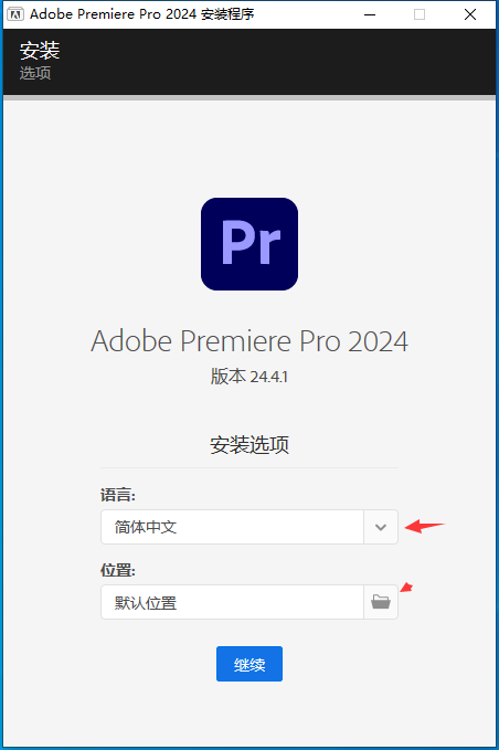 3、自定义安装位置,选择语言,点击继续(如下图)