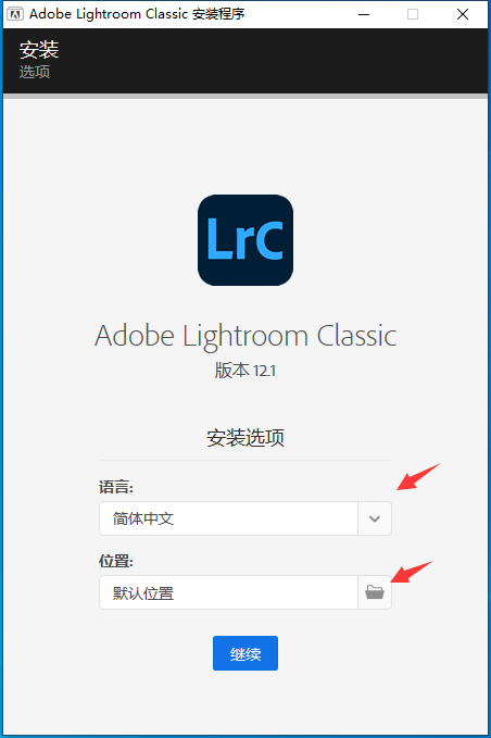 3、自定义安装位置,选择语言,点击继续(如下图)