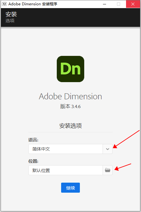 3、自定义安装位置,选择语言,点击继续(如下图)