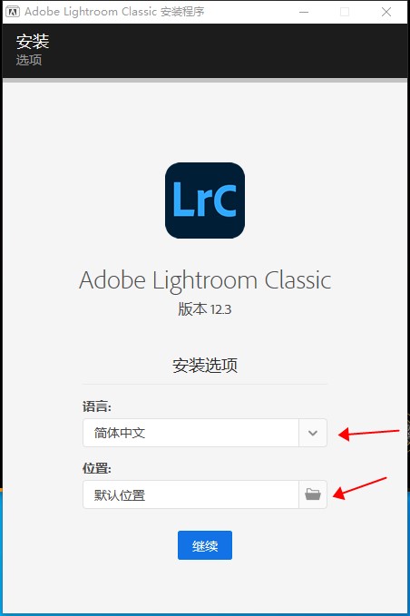 3、自定义安装位置,选择语言,点击继续(如下图)