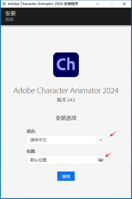 3、自定义安装位置,选择语言,点击继续(如下图)