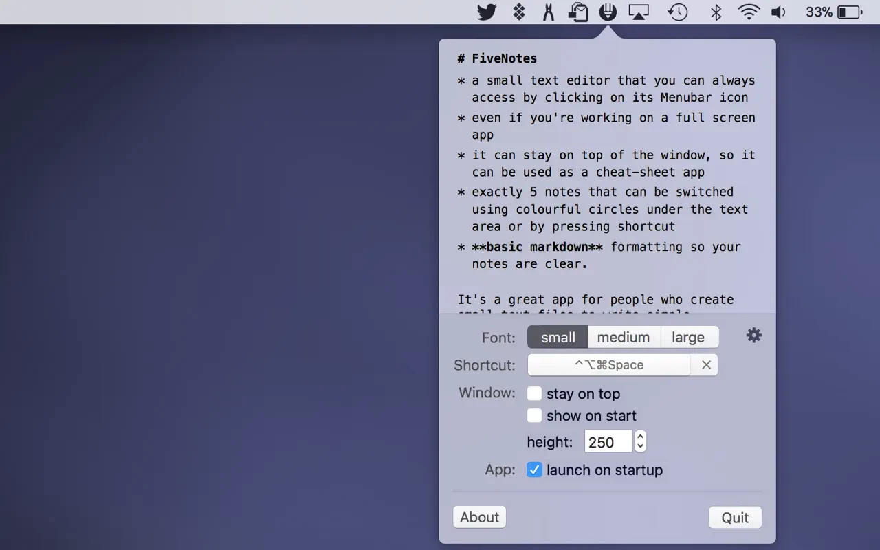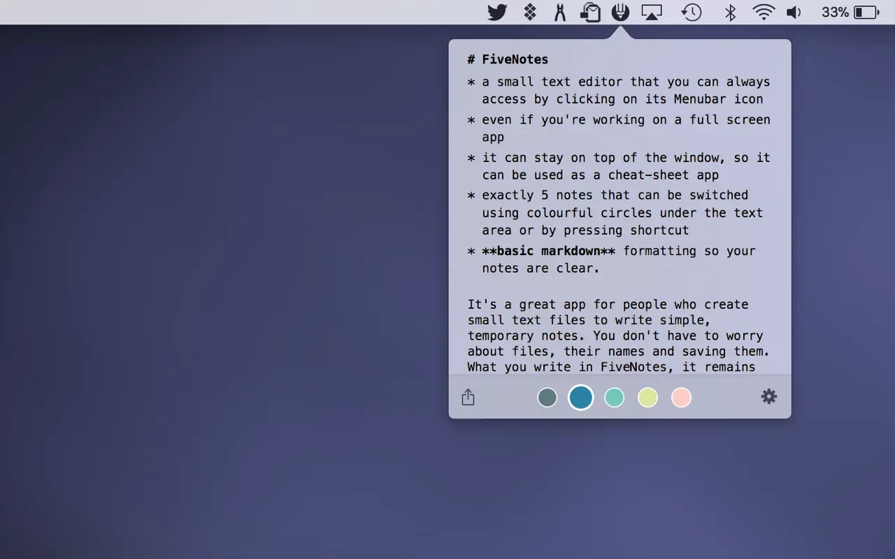 一次点击即可获得五条注释。随时可用。FiveNotes是一款小型文本编辑器,您可以随时通过点击(或按快捷键)其状态栏图标来访问它。即使您正在使用全屏应用。如果您愿意,它可以停留在窗口顶部,因此可以用作备忘单应用。FiveNotes 提供 5 条注释,可以使用文本区域下方的彩色圆圈或按快捷键(cmd+shift+[ 和 cmd+shift+] 或 cmd+注释编号)进行切换。
